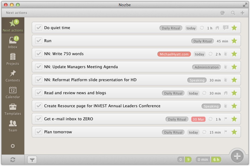 - Create a to-do list with my top three must-dos. Before I wake up in the morning, I already know what my top three must-dos are for the day. These are the non-negotiables. I am committed to making them happen no matter what. I list them in Nozbe in priority order. (These are in addition to my routine habits.)